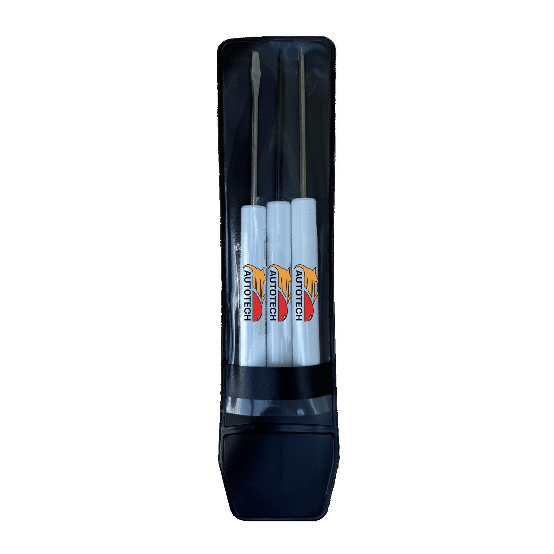 Set includes Mi8801 Pocket screwdriver – Flat Tip, Mi8805 Pocket Screwdriver – #0 Phillips blade, Mi8812 Pocket screwdriver – 2.5mm Tech blade, stored in a vinyl pouch. Screwdriver barrels will all be the same color with the same imprint on all. The vinyl pouch is constructed of black vinyl with a clear view front. Complies with Prop 65. 6.5″ H x 2″ W x 0.5″ D