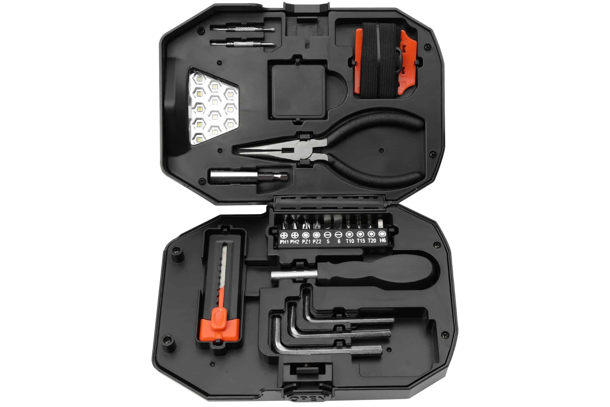 The Built2Work Flashlight 22-Piece Tool Set features an innovative, space-saving design with a flashlight built into the toolbox. It conveniently doubles as a headlamp and features straps that allow it to be carried easily. This 22-piece set is constructed from ABS plastic and comes with a box cutter, an Allen wrench set, a socket set, a pair of pliers, a 1M tape measure, a connector, and a mini screwdriver. Plus, three AAA Batteries are included with your purchase. 7.87″ D x 5.51″ W x 2.76″ H