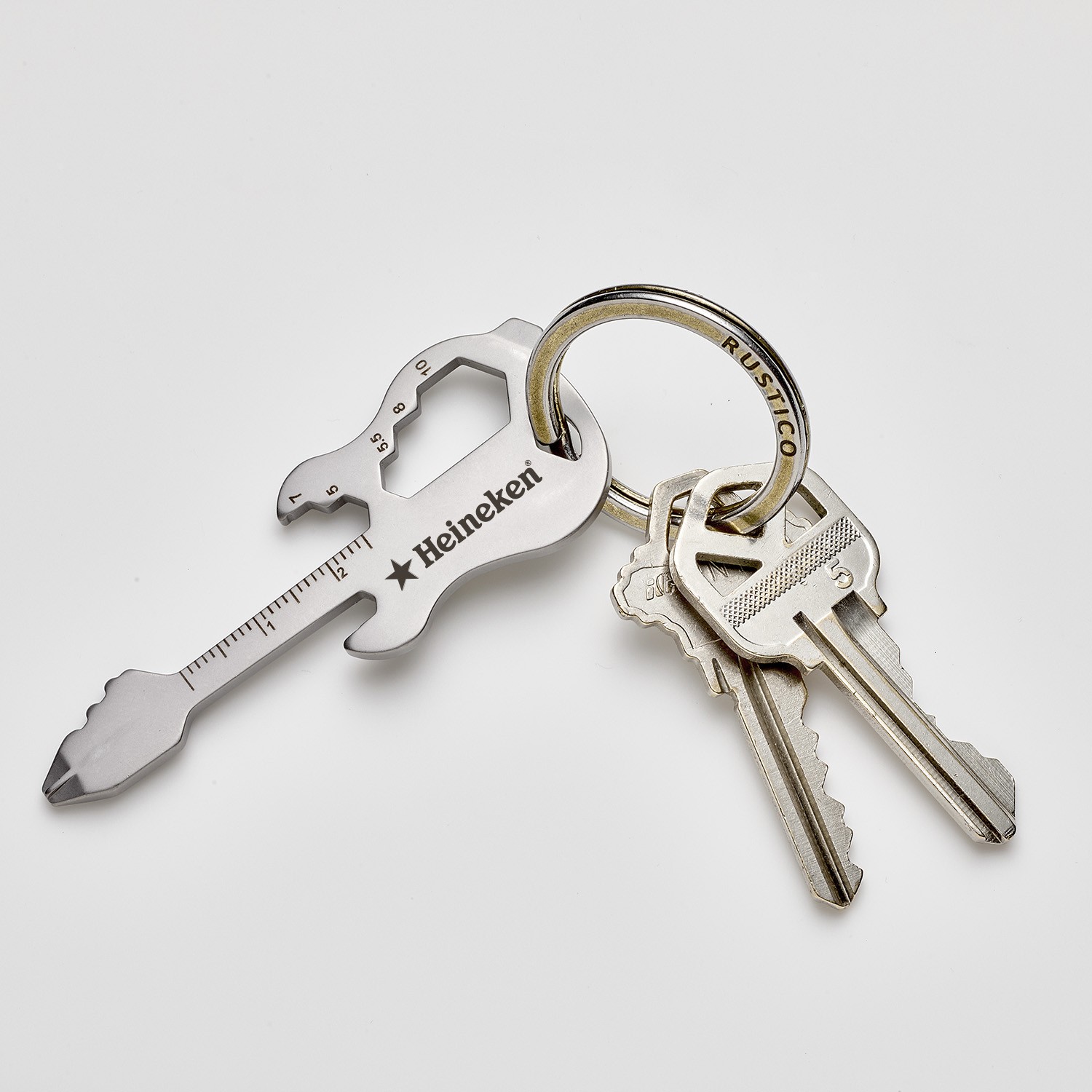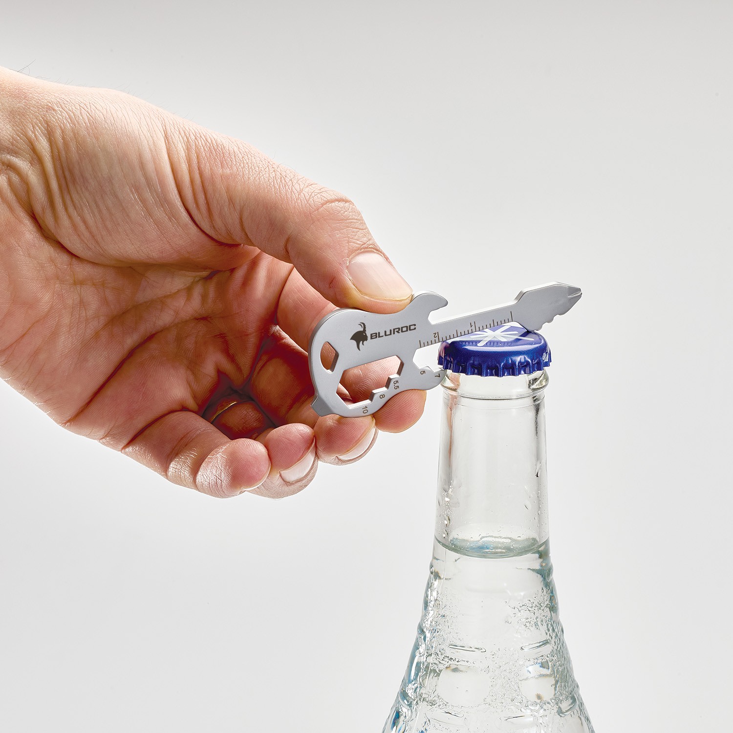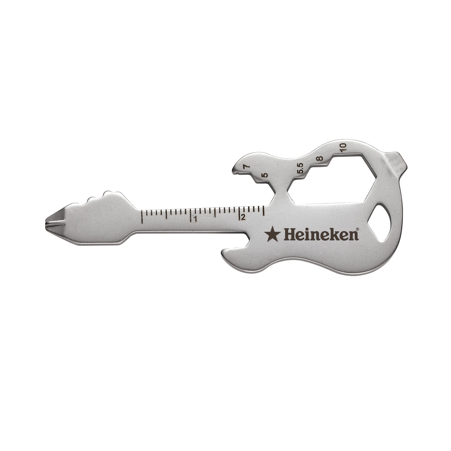3″ long all stainless-steel multi-tool in the shape of a guitar. 12 Functions: 5 hex wrench sizes (5mm—10mm), 2 spoke key sizes, flat head screwdriver, Phillips screwdriver, bottle opener, keychain hole, and a ruler. TSA friendly. Laser engraved. Boxed. 0.2″ H x 1.2″ W x 3″ L