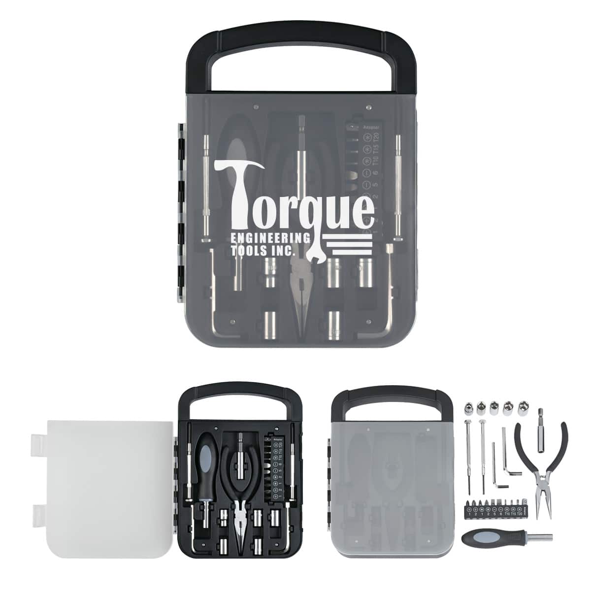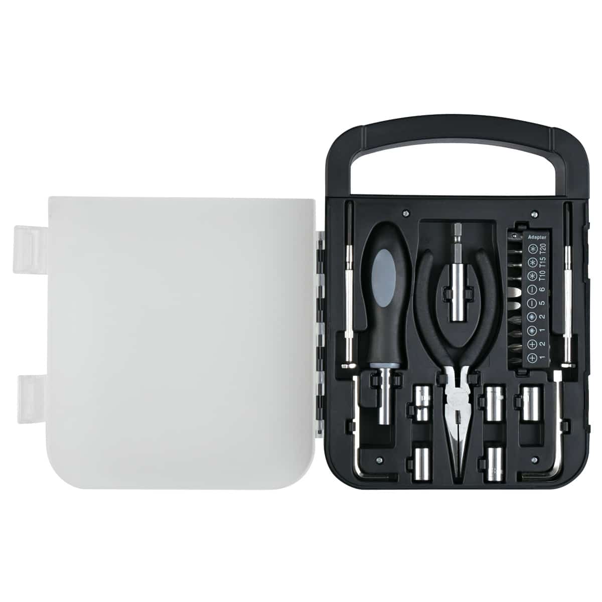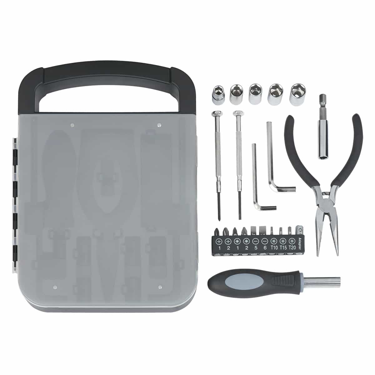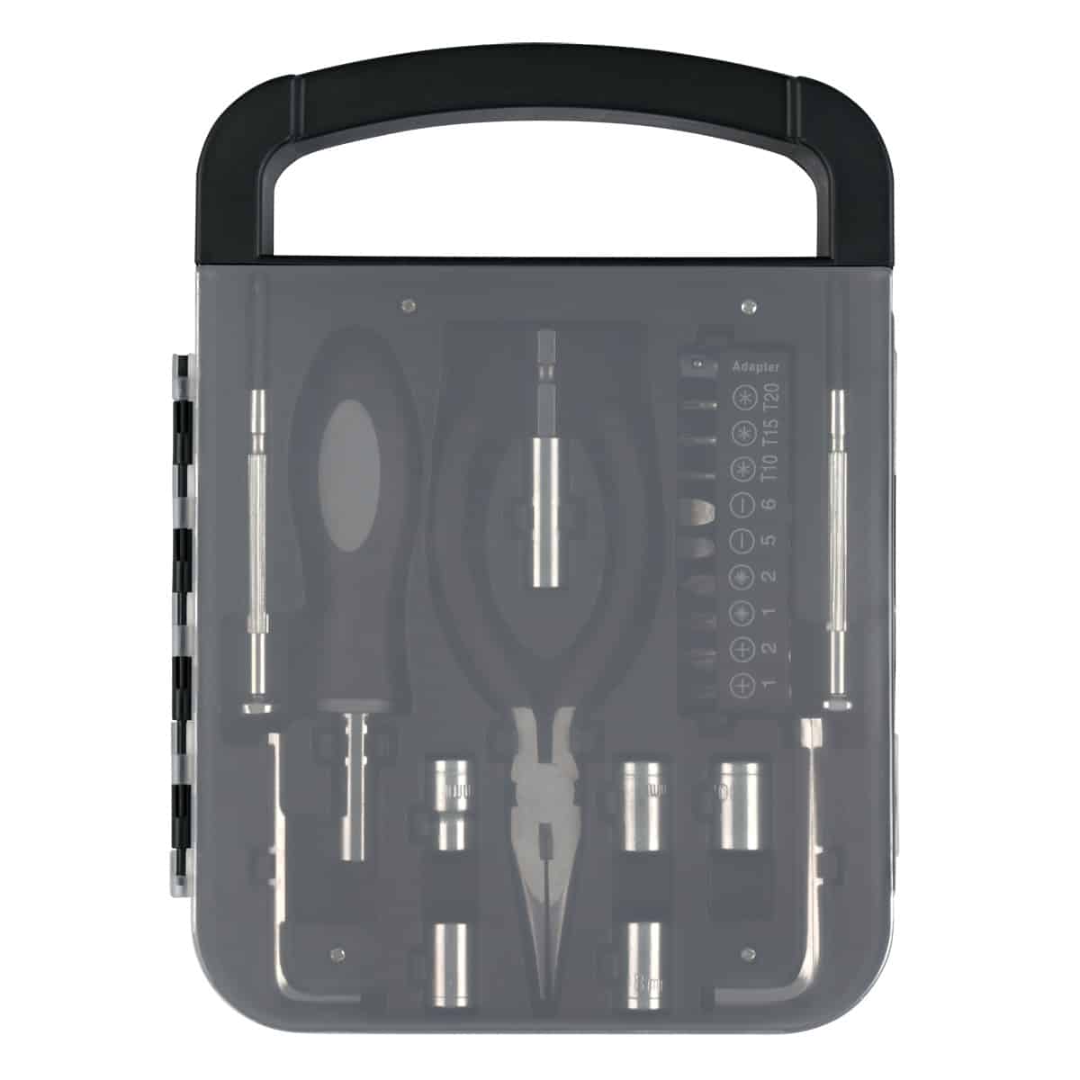 Includes 4 Phillips Head Bits, 3 Torx Head Bits, 2 Flat Head Bits, 5 Sockets, 2 Allen Wrenches, Mini Phillips Head Screwdriver, Mini Flat Head Screwdriver And Needlenose Pliers. Easy Carrying Handle. Complies with Prop 65. 6.25″ W x 8.5″ H