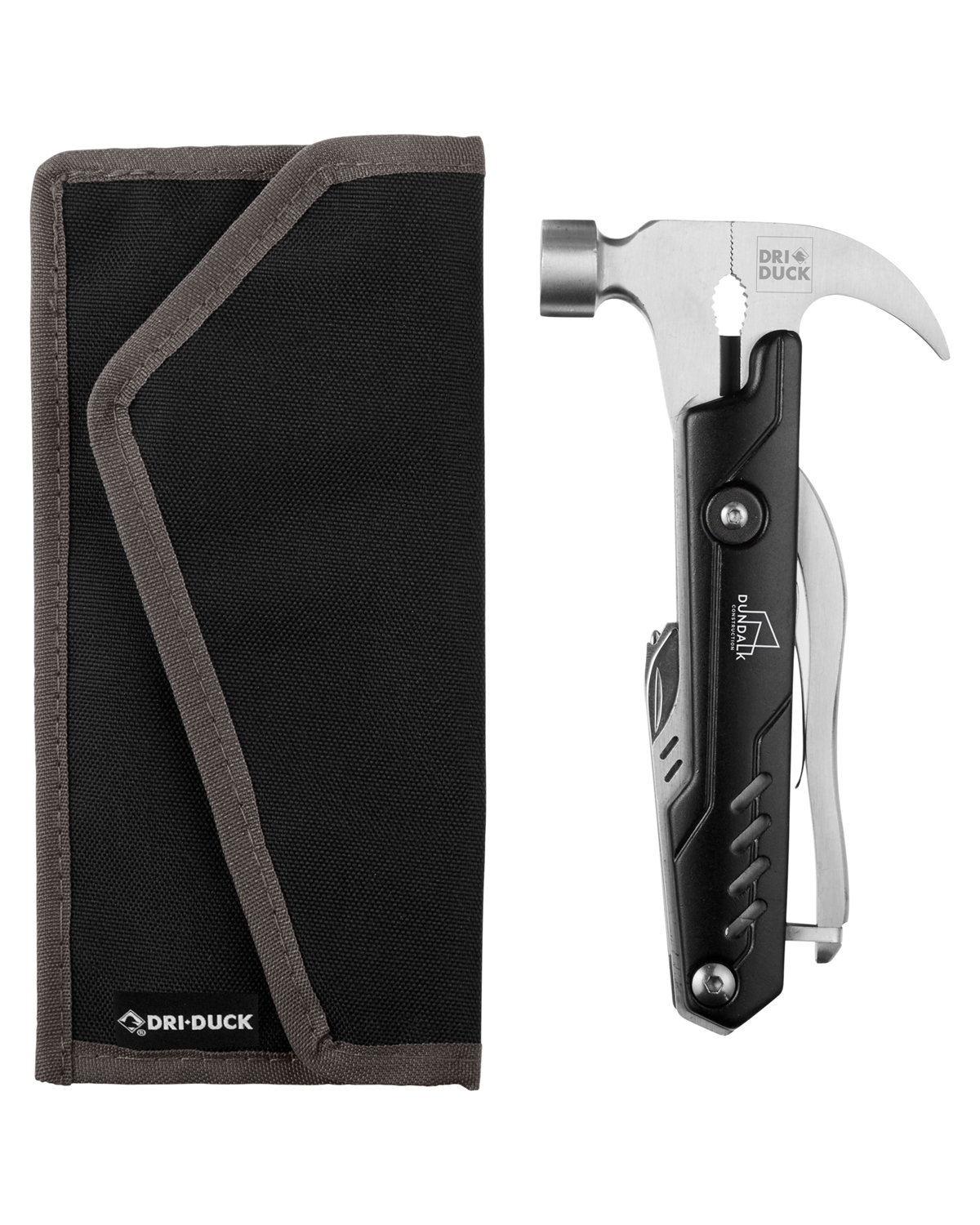Stainless steel, 600D recycled polyester. This robust product has all the essential tools you need. 11 functions, including:. nail claw. hammer. two (2) pliers. wire cutter. knife. saw. nail file. bottle opener. two (2) screwdrivers. 3.5000″ W x 6.9000″ H x 0.8000″ D