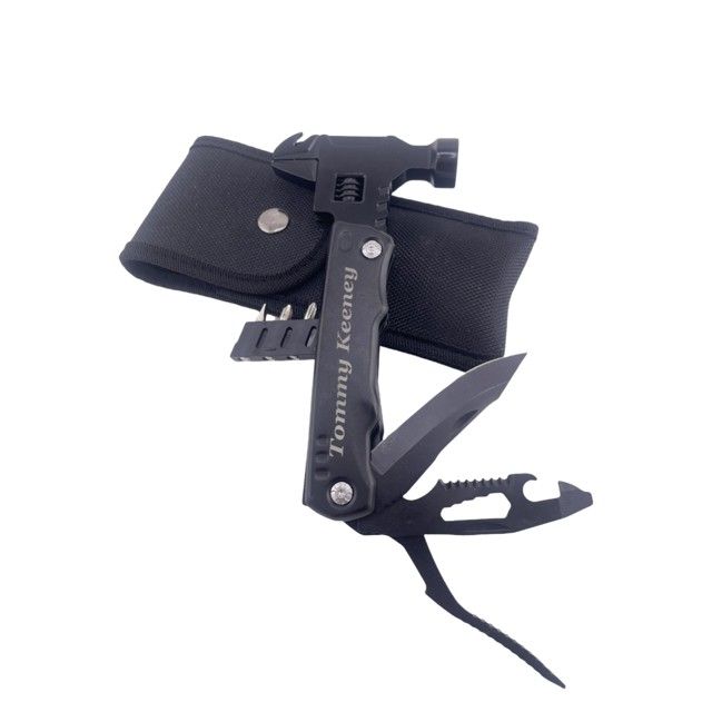 This stainless steel Hammer Multi Tool has 15 functional uses and includes a hammer, pliers, monkey wrench, screwdrivers, and 2 knives. The handle laser engraves to silver. Sure to impress, this multi-tool is ideal to keep in the car, backpack, toolbox, junk drawer, or even in your desk to handle the little problems that come up at work. A black pouch is included.