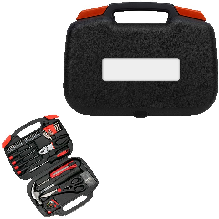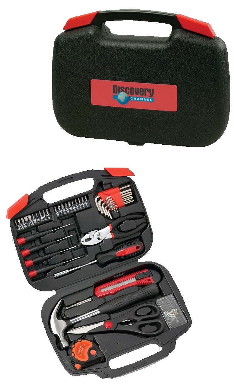 Includes slip joint pliers, utility knife, 4 precision screwdrivers, magnetic bit drive, 2-bit sets, Allen wrench set, claw hammer, scissors, assorted fastener set and a 12′ tape measure. 10.5″ D x 11.75″ W x 2.5″ H